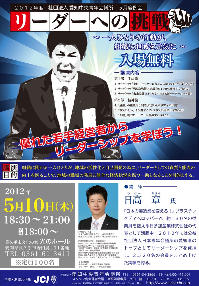 当日は、2010年度 公益社団法人日本青年会議所 東海地区 愛知ブロック協議会の会長を務められた日高章氏を講師にお招きして、リーダーシップを学ぶ講演を開催致しました。