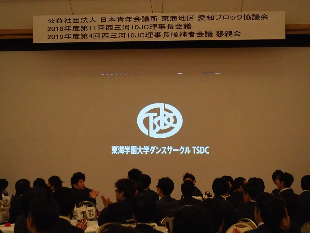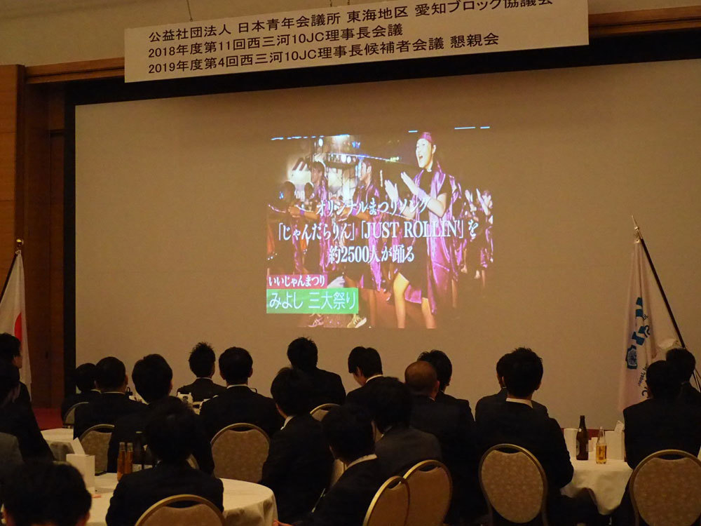 | 事業PR | 本例会では、「みよし市の魅力を発信!」と題しまして、西三河9青年会議所132名のメンバーの方々に、みよし市の祭りで踊るいいじゃん踊り、みよし市が世界に誇る大提灯を中心にピーアールさせていただきました。ムービーでみよし市の魅力を紹介するほかに、みよし市に所在する東海学園大学ダンスサークルの生徒たちによるいいじゃん踊りの実演、西三河10青年会議所の名前が入った提灯を土産に配ることにより、みよし市のことを知っていただけるきっかけをつくりました。本事業を行うにあたり、地域活性のためには、まずその地域のことをよく学ぶということが重要だと気付かされました。地域活性化のために、これからも活動地域のことを学び続けようと思います。 |