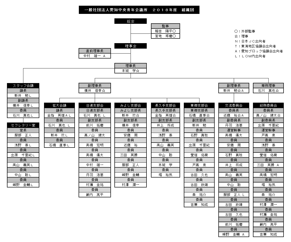 メンバー一人ひとりが愛知中央青年会議所に入会をした動機は様々だと思います。しかし、貴重な時間とお金を使ってJC運動を行うことを選択した思いは同じです。同じ志を持ったメンバーが英知と勇気と情熱を集結させることが、大きな運動につながり、組織力を高めていきます。こうして高まった組織としての求心力を外へと発信することで、活動エリアへと還元しながらより多くの人材を確保していく。今後につながる組織の好循環を醸成していきます。2018年度は愛知中央青年会議所にとって変革の一年であり、この変革が愛知中央青年会議所の輝かしい百年先(みらい)へと繋がっていくことを確信し、邁進してまいります。